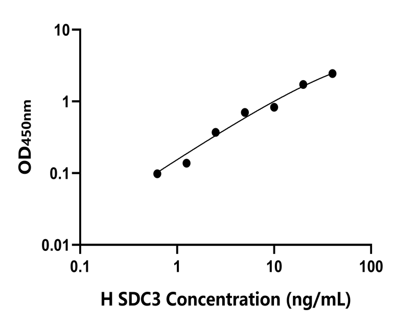 本試劑盒采用雙抗體夾心法ELISA技術 : 將捕獲抗體包被于酶標板上,捕獲樣品及標準品中的待測物SDC3,清洗后,再加入生物素標記的檢測抗體進行孵育后清洗,形成“捕獲抗體-抗原-檢測抗體”免疫復合物,隨后加入鏈霉親和素偶聯(lián)的辣根過氧化物酶進行孵育,待孵育結束后清洗,接著加入TMB顯色后,若樣本中有待測物則顯藍色,加入終止液停止反應。檢測過程中游離的成分均被洗去,用酶標儀在450 nm處測OD值,顏色的深淺和樣品中的待測物的含量呈正比,通過繪制標準曲線計算出樣本中SDC3的濃度。