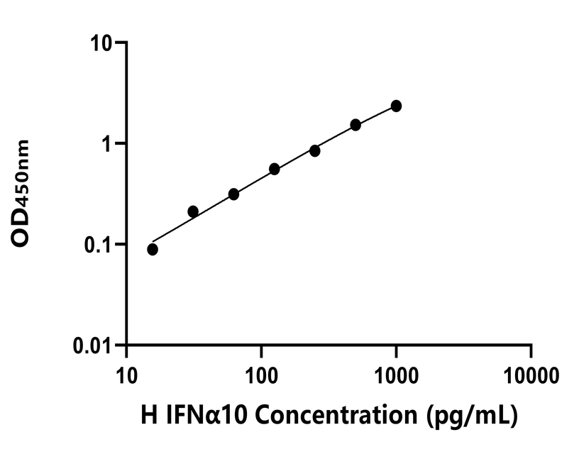 本試劑盒采用雙抗體夾心法ELISA技術 : 將捕獲抗體包被于酶標板上,捕獲樣品及標準品中的待測物IFNα10,清洗后,再加入生物素標記的檢測抗體進行孵育后清洗,形成“捕獲抗體-抗原-檢測抗體”免疫復合物,隨后加入鏈霉親和素偶聯的辣根過氧化物酶進行孵育,待孵育結束后清洗,接著加入TMB顯色后,若樣本中有待測物則顯藍色,加入終止液停止反應。檢測過程中游離的成分均被洗去,用酶標儀在450 nm處測OD值,顏色的深淺和樣品中的待測物的含量呈正比,通過繪制標準曲線計算出樣本中IFNα10的濃度。